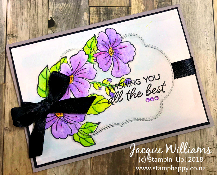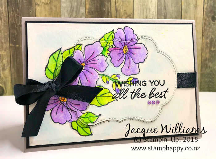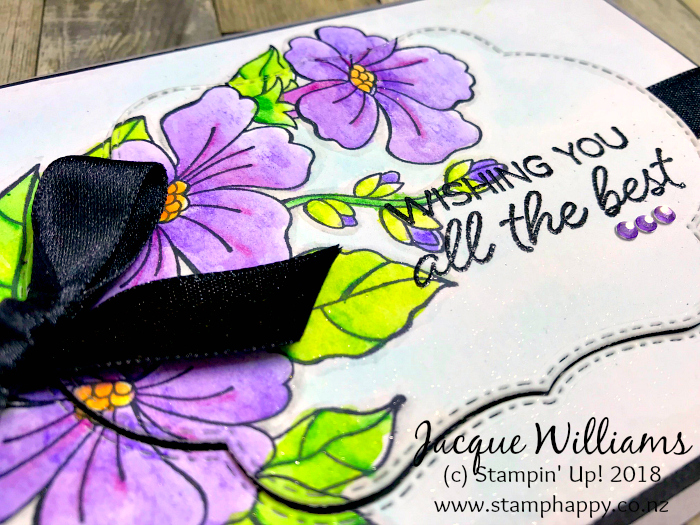 During August only, you can order the Blended Season stamp set, dies or both together (bundle)! This stamp set features images that are suitable for all four seasons. Today’s share, I’ve used the large Petunia stamp: