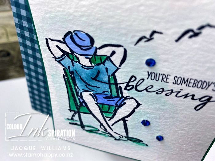 I watercoloured in the tag with our challenge colours and use a bit of silver foil to reinforce around the tag top. I thought this beautiful combination of blues and greens was great for this particular image.