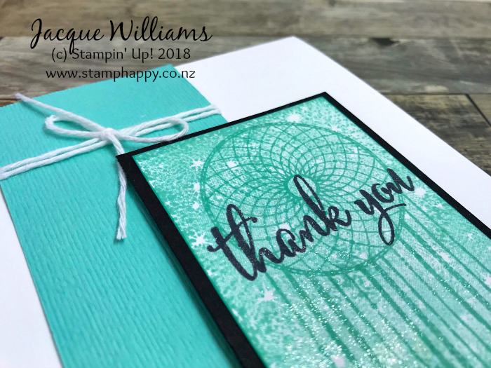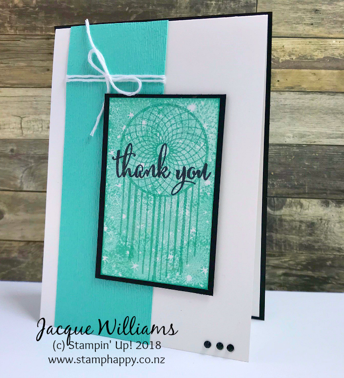 Coastal Cabana is one of my top three favorite colours, and I love the simplicity of this card. The dreamcatcher is paired with the Bokeh Dots stamp set for a subtle main image.