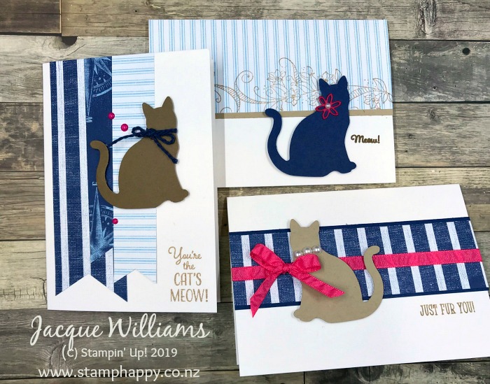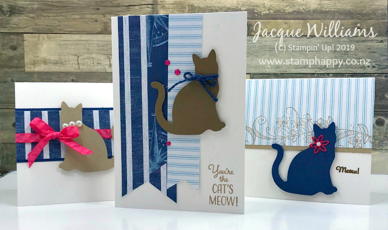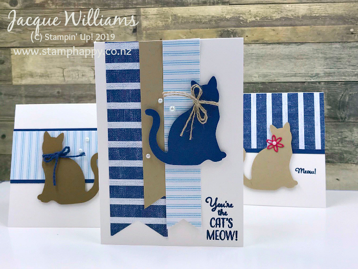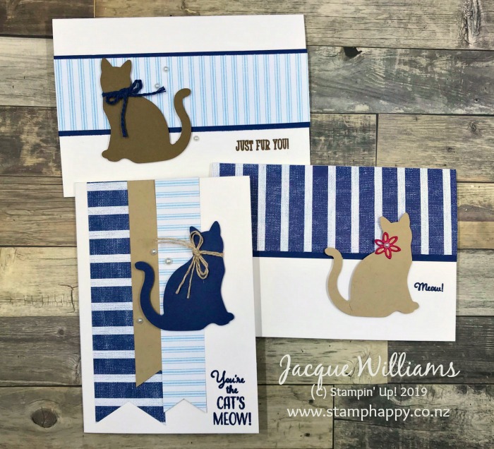 I posted two weeks ago some kitty cards for a colour challenge, which I then used as the design foundation for the actual cards my team and I made to donate to a local cat rescue organization. I had quite a few strips of the Come Sail Away Designer Series Paper left over after making a scrapbook page and envelopes with it, so these cards were perfect to use up those last little bits: