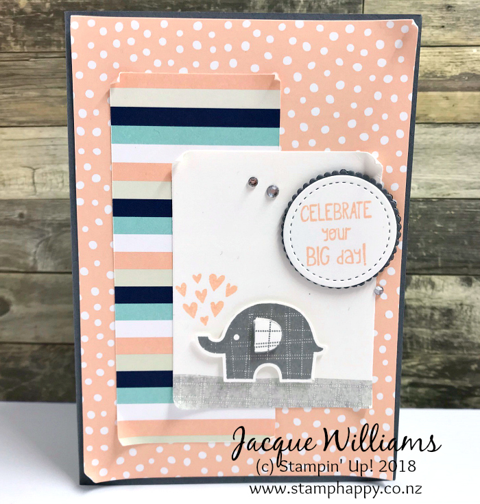 This stamp set bundles with a punch, making for reasonably quick projects with dimension. I stamped out two elephants here and used the second one to punch out an extra ear for dimension.