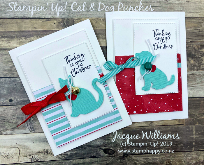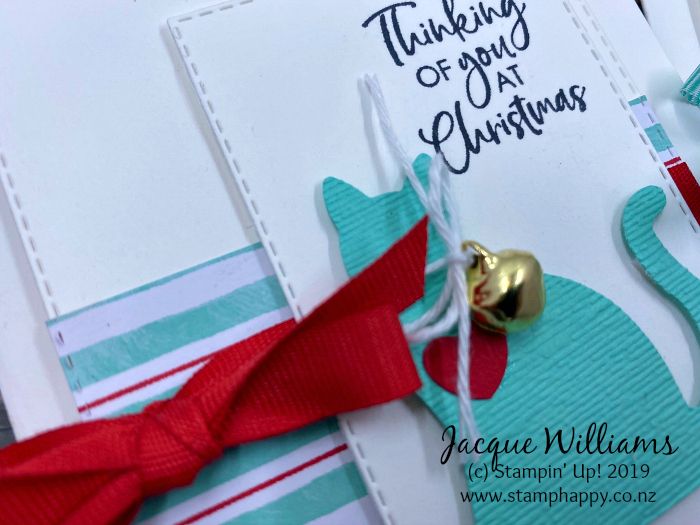 To make this a Christmas card, I simply changed up the papers and the sentiment, and then added a little jingle bell to the cat’s collar. I had one of my class attendees ask if we could do something like this at the Christmas Stamp-A-Stack I’m holding this weekend. They did turn out pretty cute!