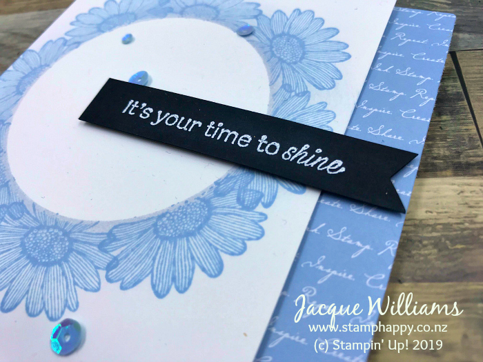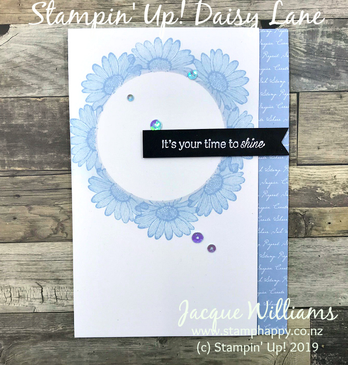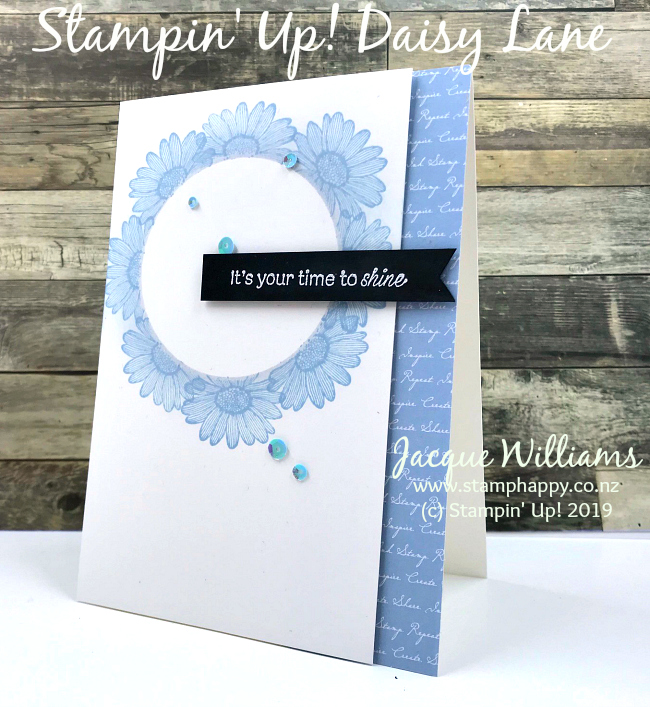 We have used the new Daisy Lane stamp set to create that pretty wreath. The idea is effective: simply create a circular mask and stamp around the circle to create the wreath.
