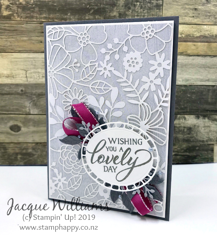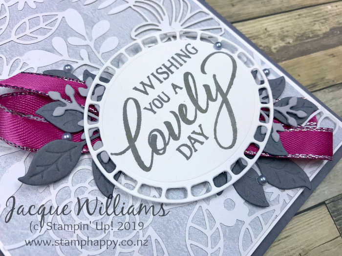 A little fold of bright ribbon underneath gives a splash of colour to lift the grey. I went for Berry Burst, possibly my second most absolute favorite color!