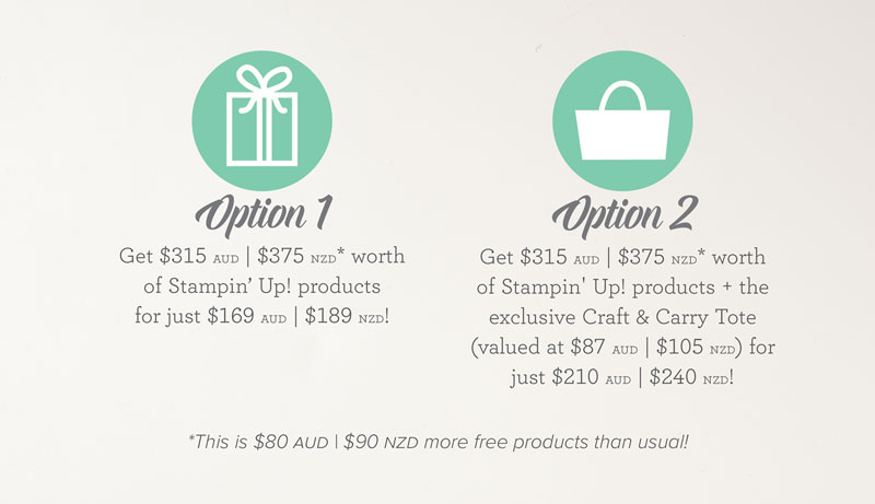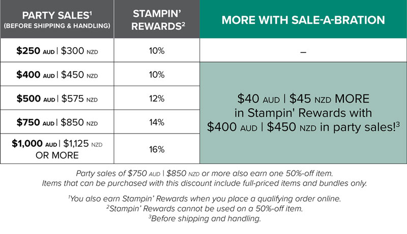 Earn more during SaleABration! Host a workshop with your friends, simply combine orders together, or place a larger order yourself to benefit! Any personal or group orders totalling $450 NZD or more receive an additional $45 to spend on top of the host benefits!