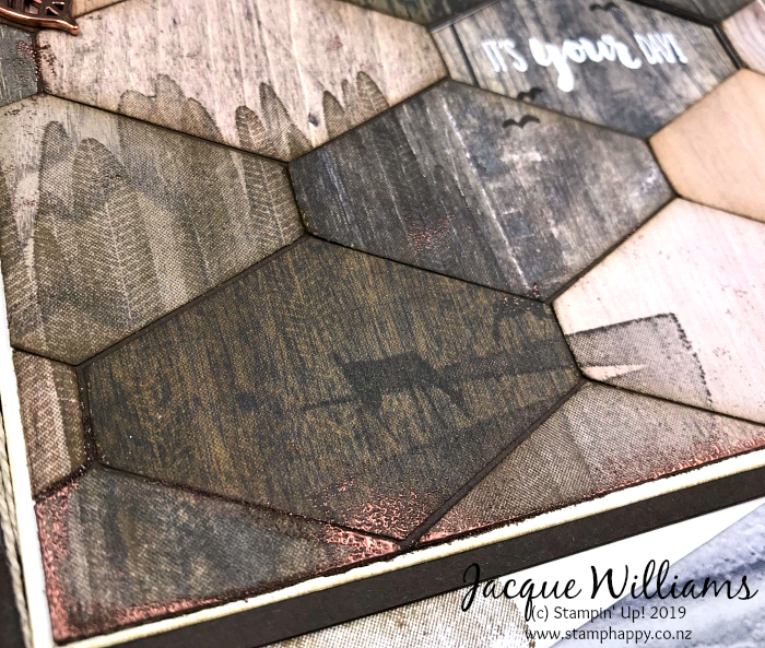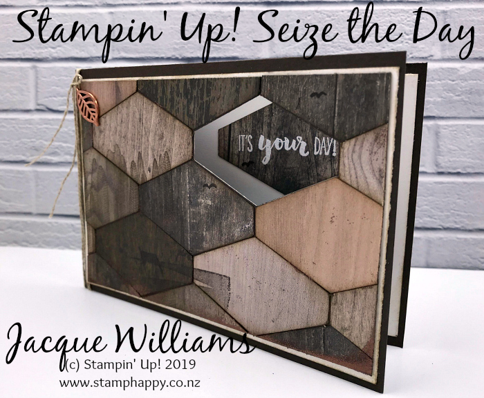 I’ve punched right through the card front with the Tailored Tag Punch to create a peek-a-boo window here. You could leave the front as a solid print or cardstock, but I chose to carry on the shape and create a sort of tile pattern with the Wood Textures Designer Series Paper.