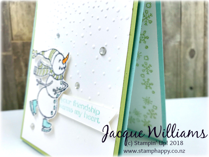 I love the fresh colours with this card, and they are great paired with the snowman theme. Of course, we don’t get snow during Christmas in New Zealand, but snowmen are a fun motif and certainly great for sending to our northern hemisphere friends!