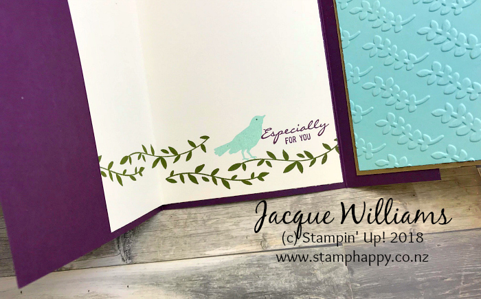 Open the Blackberry Bliss card to reveal stamping with the gorgeous images from the Botanical Bliss stamp set. I just love that bird, but as I taught at the Extravaganzas, he definitely looks better with an eye. Any green Stampin’ Write Marker will do.