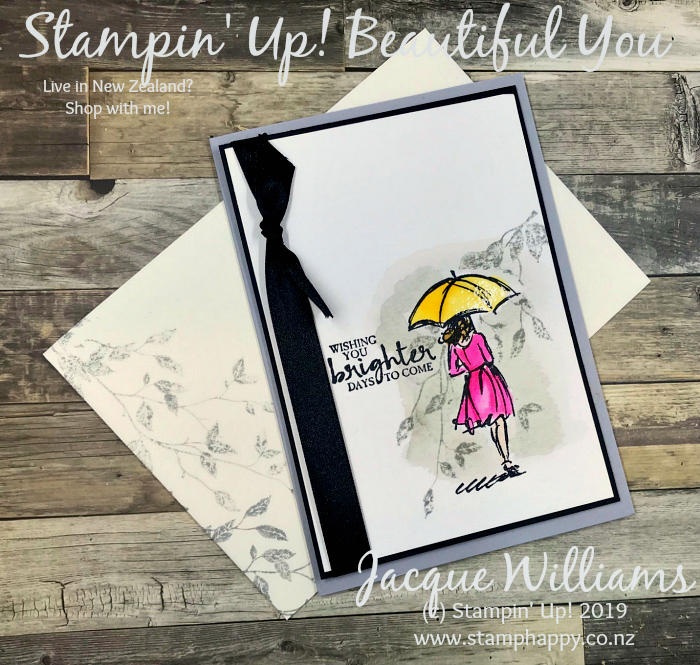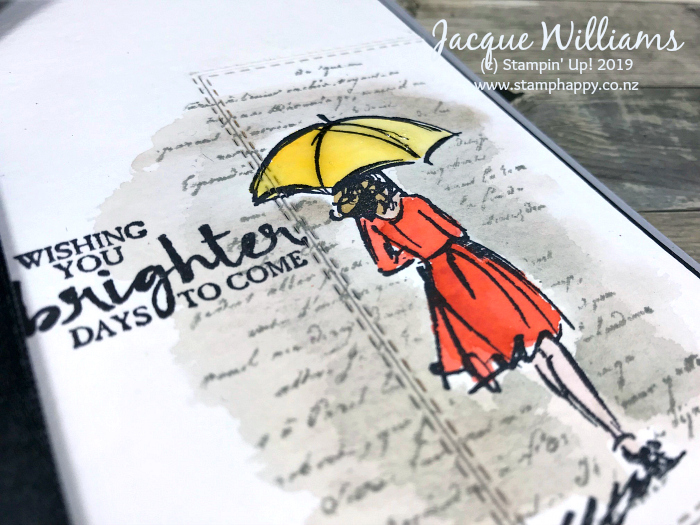 I’ve chosen to use the Beautiful You stamp set. This image with the woman and the umbrella is quite sweet for a sympathy card without being too much of a downer: