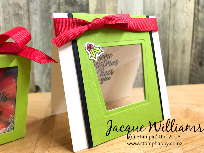 The Takeout Treats die set comes with a die that cuts out a perfect window in the box, and as you can see – also in a little gift card. You will need to use Jet Black Staz-On to stamp on window sheets (acetate), for a fun way to add images or sentiments.
